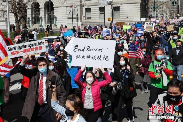 当地时间4月4日,纽约举行反仇恨亚裔大游行,上万民众手持标语在曼哈顿弗利广场集会后,游行穿过布鲁克林大桥至布鲁克林卡德曼广场。 中新社记者 廖攀 摄