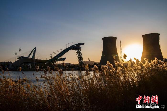 资料图:首钢滑雪大跳台是北京赛区第一个新建比赛场馆,将作为2022北京冬奥会自由式滑雪、单板滑雪项目的正式比赛场地。图为夕阳下的首钢滑雪大跳台。中新社记者 侯宇 摄