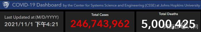 美国约翰斯·霍普金斯大学11月1日发布的新冠疫情最新统计数据显示,全球累计新冠死亡病例累计达5000425例;累计新冠确诊病例增至246721929例。