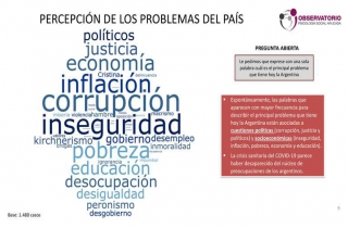 调查报告指出:“描述阿根廷当下主要问题所使用最多的词语与政治问题及社会经济问题有关,分别是腐败、司法正义、政治、社会治安、通胀、贫穷、经济及教育”;“对卫生危机的担忧反倒排在倒数第二位。”