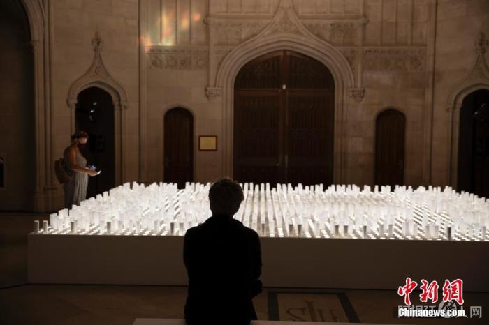 当地时间10月7日,美国纽约绿林墓地教堂内陈设由艺术家创制的互动艺术装置“终结之后”(After the End)。作品由上百支写有寄语的纸筒组成发光祭坛,参观者可在现场书写寄语放入祭坛,表达对新冠逝者的悼念。 中新社记者 廖攀 摄