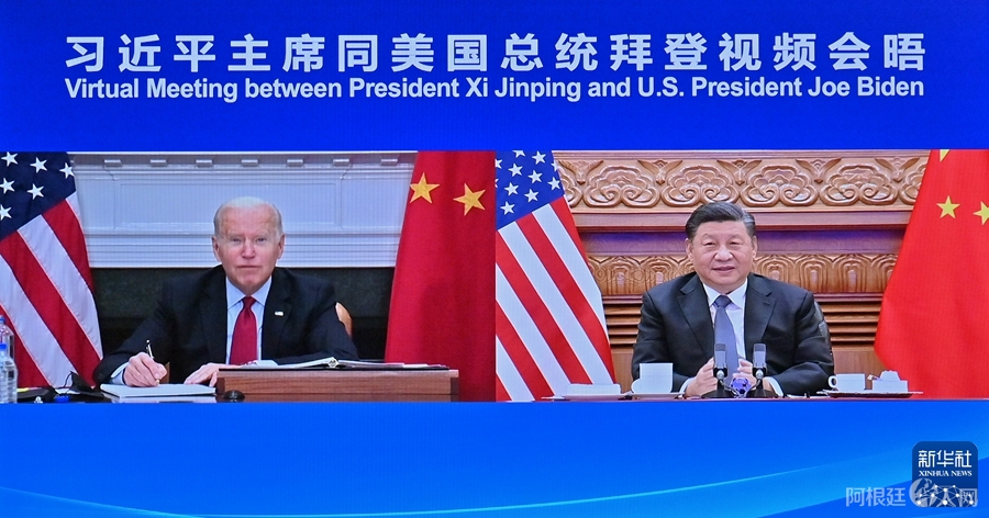 11月16日上午,国家主席习近平在北京同美国总统拜登举行视频会晤。新华社记者 黄敬文 摄
