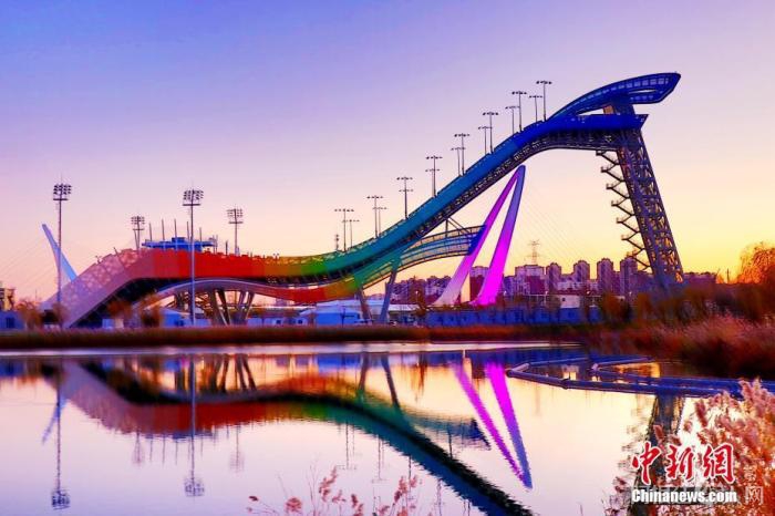 2021年11月12日,北京冬奥公园紧邻首钢园区,滑雪大跳台与首钢大桥交相辉映。 中新社发 牛云岗 摄 图片来源:CNSPHOTO