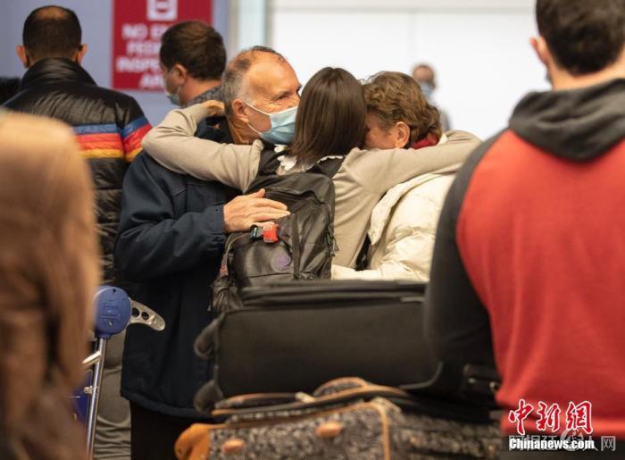 资料图:当地时间11月8日,一位女士在美国加州旧金山国际机场的国际航班到达区域拥抱来自法国的父母。美国8日起放宽入境限制,允许完成新冠疫苗全程接种的外国旅客乘坐国际航班或通过水陆口岸入境。 中新社记者 刘关关 摄