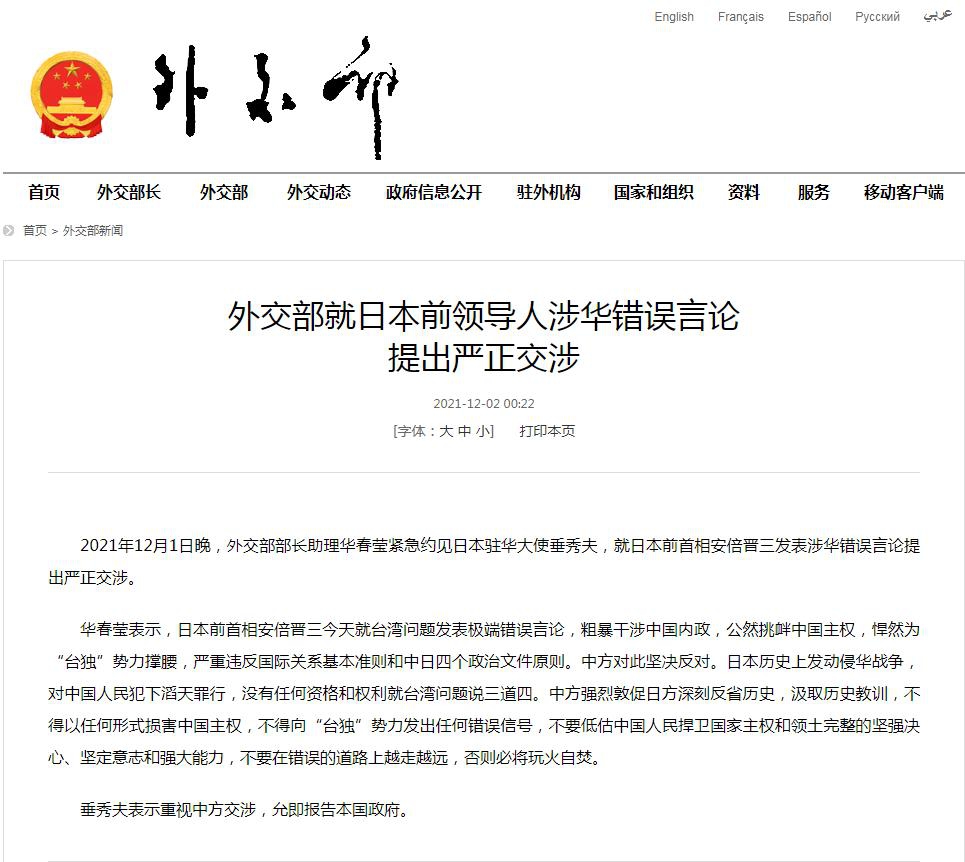 中新网12月2日电 据外交部网站消息,2021年12月1日晚,外交部部长助理华春莹紧急约见日本驻华大使垂秀夫,就日本前首相安倍晋三发表涉华错误言论提出严正交涉。