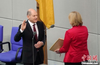 12月8日,德国新任总理朔尔茨及新政府内阁全体成员在柏林的德国联邦议院宣誓就职。当天下午,朔尔茨和默克尔在总理府举行了交接仪式,新政府正式投入工作。图为朔尔茨宣誓就职。 中新社记者 彭大伟 摄