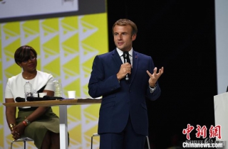 当地时间10月8日,2021年法国-非洲峰会在法国南部城市蒙彼利埃举行,法国总统马克龙出席峰会并讲话。中新社记者 李洋 摄