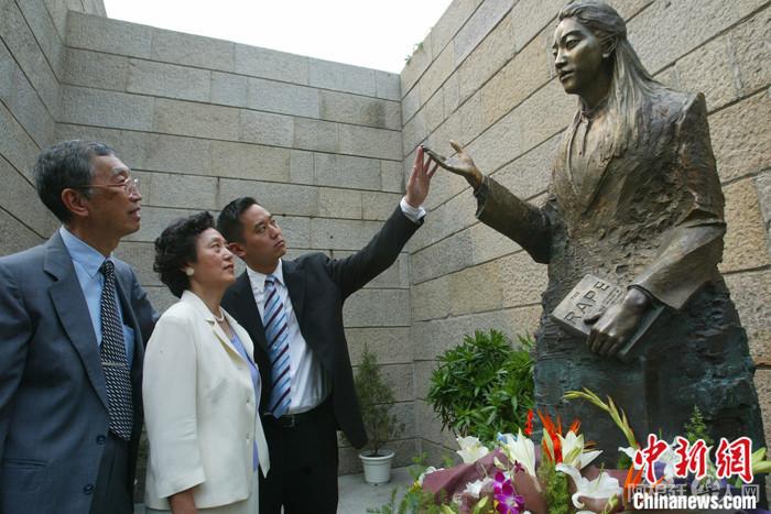 图为2005年9月9日,侵华日军南京大屠杀遇难同胞纪念馆内,张绍进(左一)、张盈盈(左二)夫妇为他们的女儿张纯如的雕塑揭幕。(资料照片) 中新社记者 泱波 摄