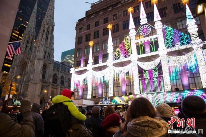 当地时间12月8日,随着圣诞节的临近,越来越多的圣诞装饰亮相美国纽约街头,吸引路人驻足欣赏。 中新社记者 廖攀 摄
