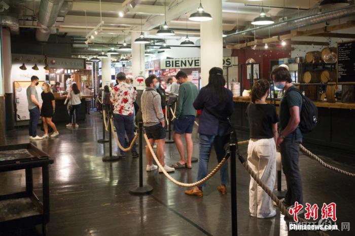 当地时间5月25日,顾客在美国纽约切尔西市场一家餐厅排队购买餐食。自5月下旬纽约州博物馆、电影院、餐厅、零售业等商业和文化场所的客容量限制全面解除后,纽约著名的切尔西市场客流逐渐恢复。 中新社记者 廖攀 摄