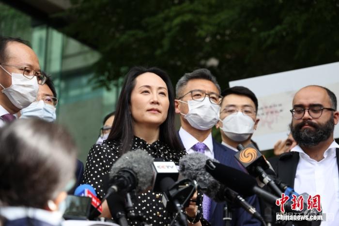 孟晚舟在加拿大不列颠哥伦比亚省高等法院门前向媒体发表声明。中新社记者 余瑞冬 摄