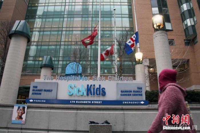 资料图:3月11日,多伦多病童医院门前降下半旗,向因新冠肺炎离世的人们致哀。这一天是加拿大设立的新冠疫情全国纪念日。中新社记者 余瑞冬 摄