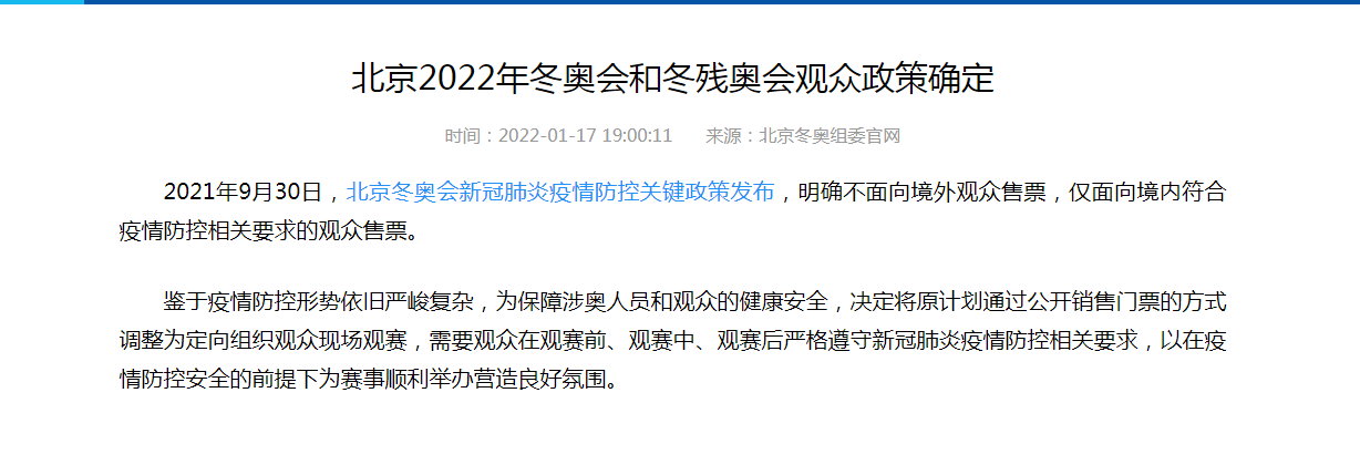 中新网北京1月17日电 17日,北京冬奥组委官网刊发公告,表示鉴于疫情防控形势依旧严峻复杂,为保障涉奥人员和观众的健康安全,决定将原计划通过公开销售门票的方式调整为定向组织观众现场观赛,需要观众在观赛前、观赛中、观赛后严格遵守新冠肺炎疫情防控相关要求,以在疫情防控安全的前提下为赛事顺利举办营造良好氛围。