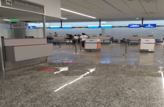 强风暴天气于今天下午2点左右抵达埃塞萨区,强降雨穿透了机场A号以及C号航站楼,部分登机区域“水漫金山”。