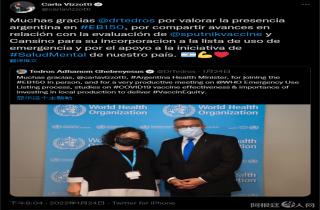 谭德赛在其个人推特平台发文称:“非常感谢阿根廷国家卫生部长卡拉·维佐蒂亲自到访参加#EB150(第150次执行委员会会议),并召开了一场关于世卫组织紧急情况物品使用清单、抗新冠病毒疫苗有效性研究以及投资生产疫苗重要性等话题的颇具成效的会议。”