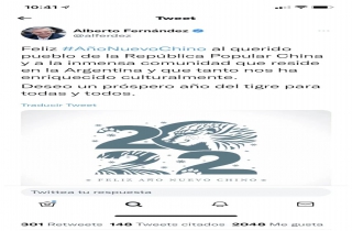 2月1日,阿根廷总统费尔南德斯发推,谨向中国人民和为丰富阿根廷文化作出贡献的广大旅阿华侨华人致以新年问候,祝愿所有人在虎年共享繁荣。