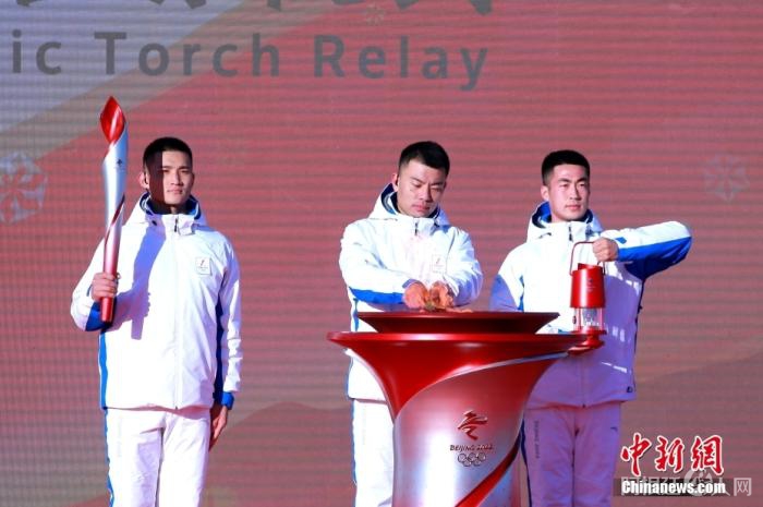 2月2日上午,北京2022年冬奥会火炬接力启动仪式在北京奥林匹克森林公园举行。图为火种护卫从火种灯中引出火种,点燃火种台。 中新社记者 李纯 摄