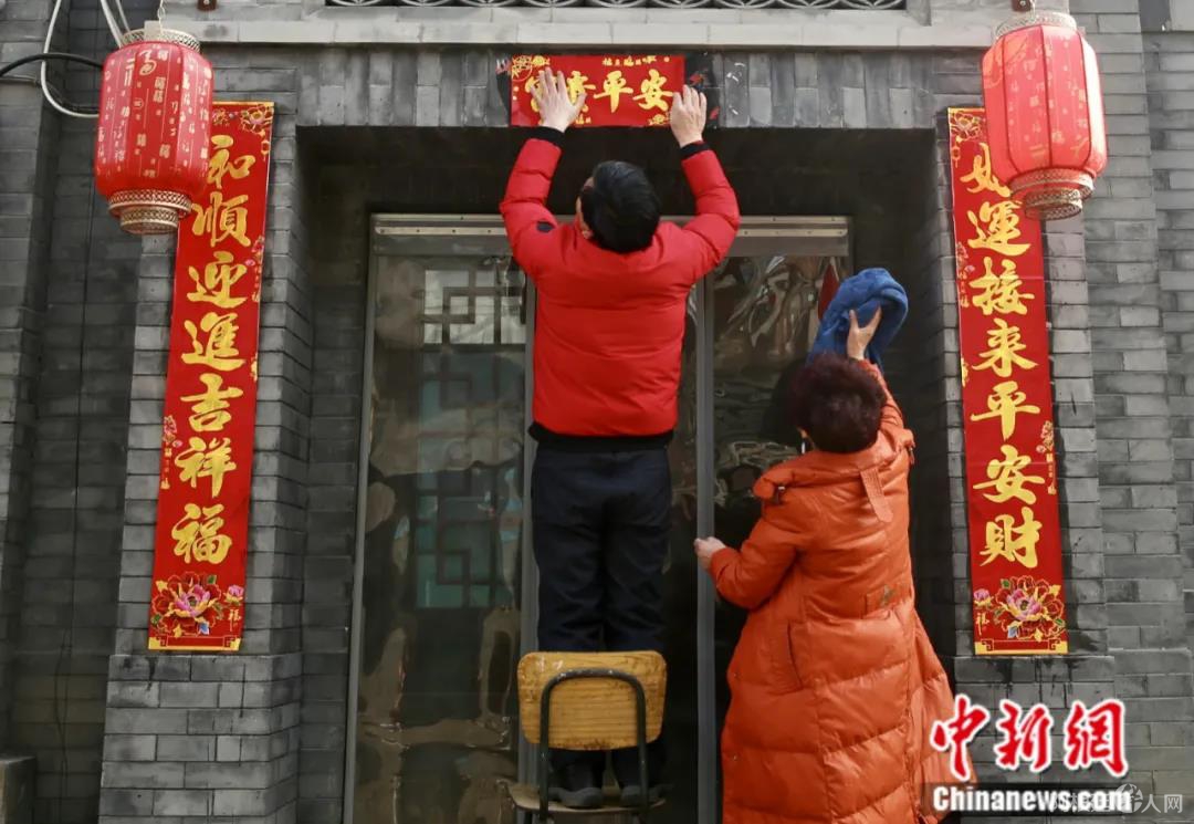 2022年1月31日,中国农历除夕,北京市民张贴春联迎接即将到来的壬寅虎年。中新社记者 易海菲 摄