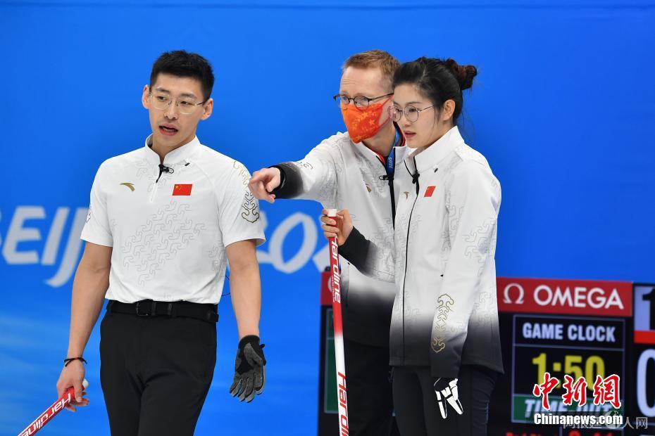 2月3日,北京冬奥会冰壶项目混双循环赛继续进行。中国队凌智与范苏圆迎来澳大利亚选手的挑战,最终二人6:5战胜对手,喜迎两连胜。中新社记者 李骏 摄
