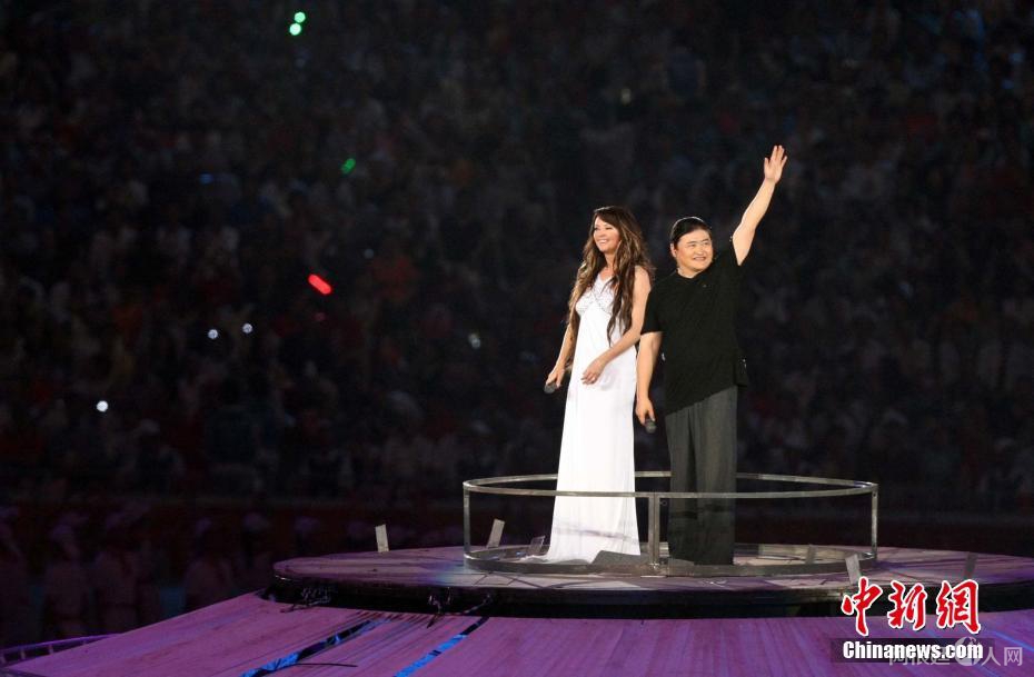资料图:图为中国著名男歌手刘欢和英国著名女歌星莎拉·布莱曼(Sarah Brightman)在“鸟巢”中央共同演唱北京奥运会开幕式主题歌《you and me》。 中新社记者 任晨鸣 摄