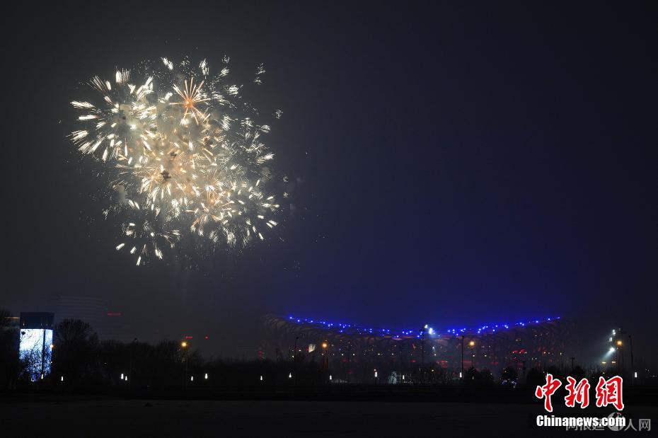 1月30日,北京,2022年北京冬奥会开幕式彩排举行,烟花在鸟巢上空绽放。 图片来源:人民视觉