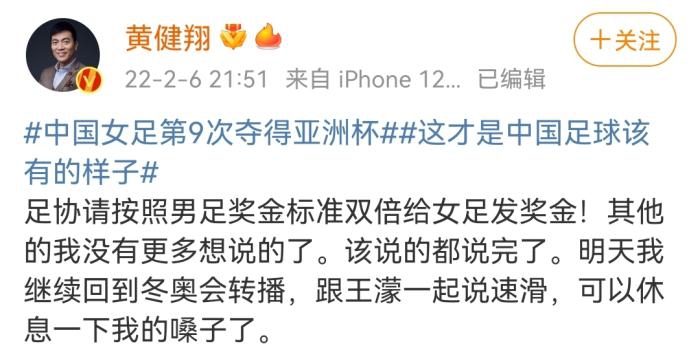 值得注意的是,知名体育评论员黄健翔6日晚在其微博发声,呼吁足协“按照男足奖金标准双倍给女足发奖金”。这也引来诸多关注。