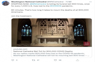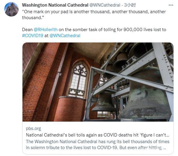 美国华盛顿国家大教堂为该国死于新冠肺炎的90万人鸣响丧钟。图片来源:华盛顿国家大教堂推文截图