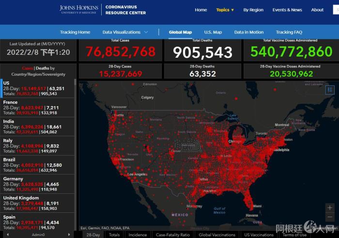 据美国约翰斯 霍普金斯大学统计数据显示,截至北京时间2月8日下午1时20分,美国已有逾7685万人确诊新冠,因新冠死亡人数则达905543人。