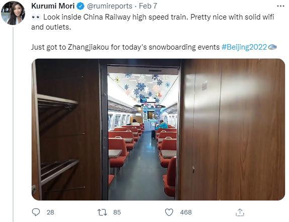 2月7日,美国彭博社记者森来实在前往张家口赛区途中,发布了多张冬奥高铁内部照片,称高铁内无线网络、滑雪储物柜和可倾斜座椅等一应俱全,直呼“非常棒”。