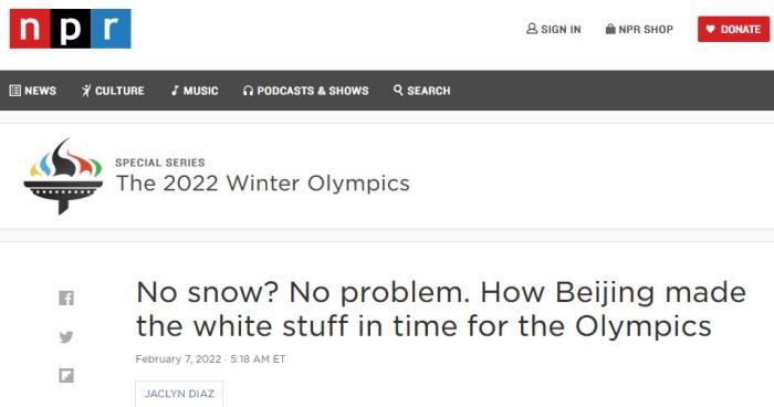 当地时间7日,美国国家公共电台(NPR)发布了一篇《没有雪?没问题》的文章,从多个角度点赞了北京冬奥会的人造雪技术。