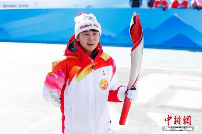 资料图:2月2日,北京冬奥会火炬在北京冬奥公园传递。图为火炬手王濛。 中新社记者 赵隽 摄