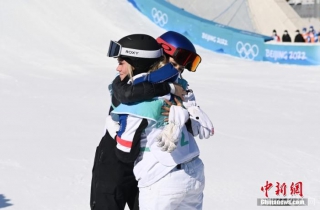 谷爱凌与获得亚军的法国选手泰丝·勒德拥抱。 中新社记者 毛建军 摄