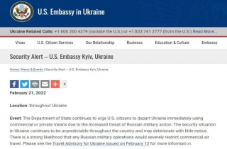 与此同时,美国驻乌克兰大使馆网站21日发布消息敦促美国公民通过商业或私人手段,立即离开乌克兰。美使馆还称,乌克兰全国的安全局势仍不可预测,可能会出现恶化。