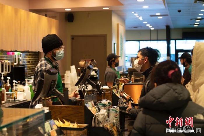 资料图:当地时间2月10日,美国纽约市皇后区一家咖啡店人们戴口罩消费。当日,纽约州政府解除针对室内公共场所和私营企业的“口罩令”,在校园“口罩令”将继续维持。 中新社记者 廖攀 摄