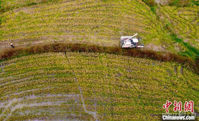 资料图:航拍江西新余仙女湖区九龙山乡后元村百亩再生稻示范基地,农民喜收再生稻。 赵春亮 摄