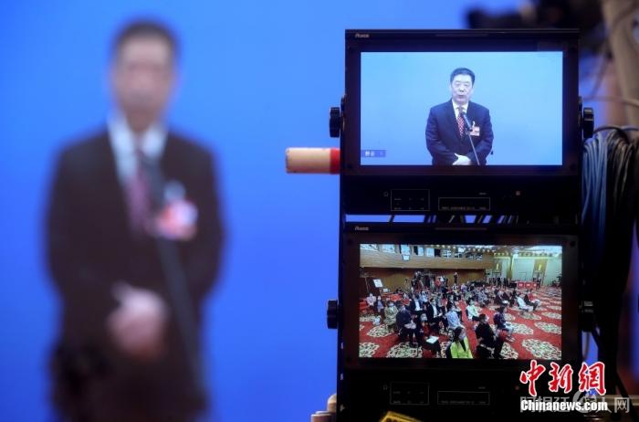 3月4日,全国政协十三届五次会议第一场“委员通道”采访活动在北京人民大会堂新闻发布厅举行。图为分会场摄像机显示屏显示的主会场与分会场画面。 中新社记者 张宇 摄
