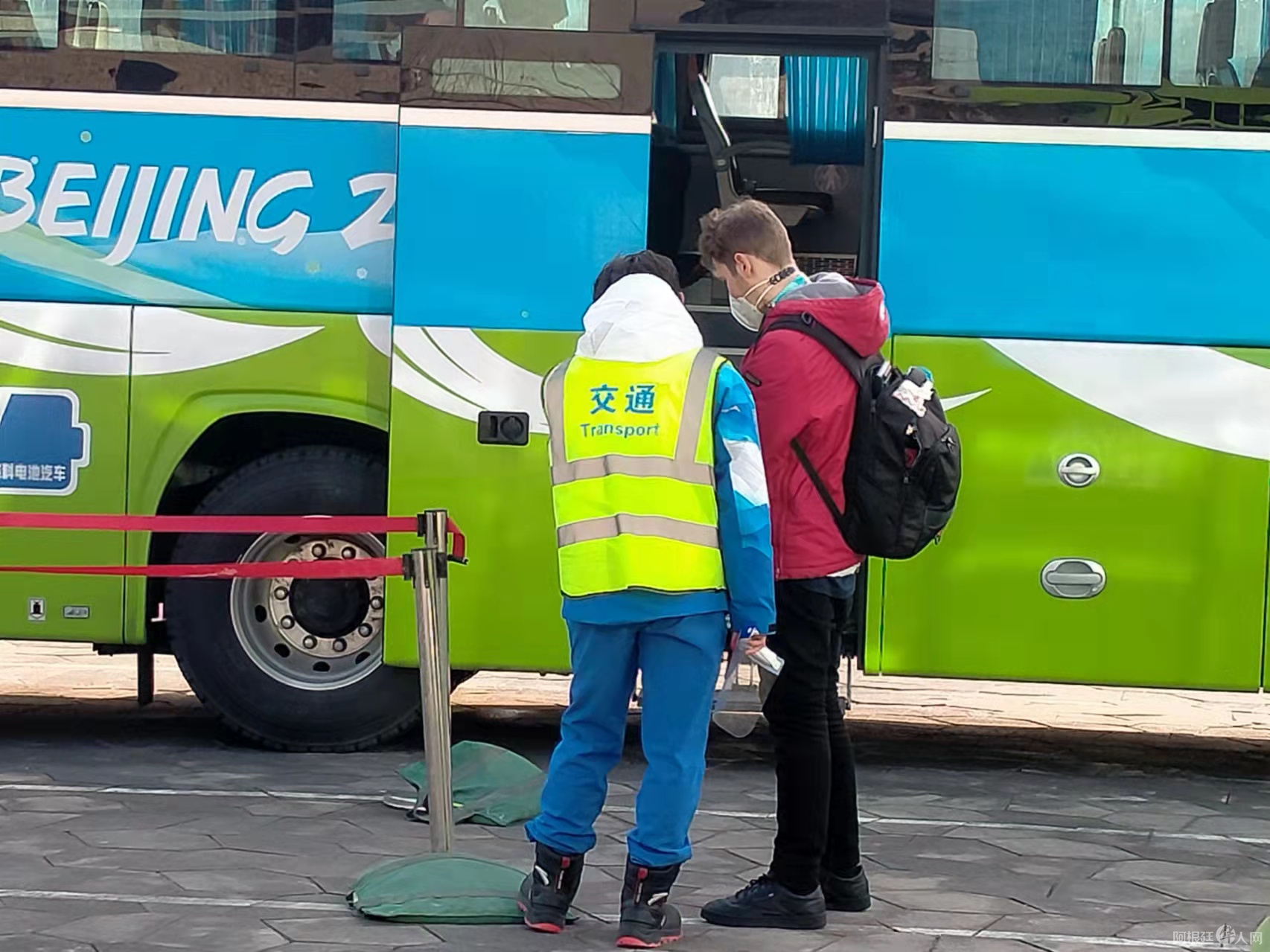 在每次比赛结束后的一段时间,摆渡班车站点前会赫然排起长队。不少记者对照着手机抬头查看班车站牌。两位志愿者迎了上去,为大家指引路线。