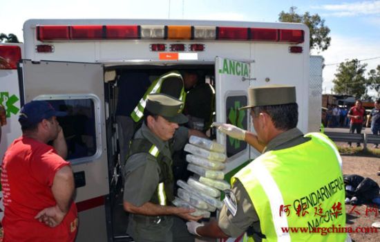 国际在线专稿:据法新社12月27日报道,当地时间12月26日,阿根廷国家警察局发布消息称,平安夜当晚,在阿根廷北部城市科连特斯市,当地警方在一辆违反交通管制的救护车上发现了近800公斤毒品。