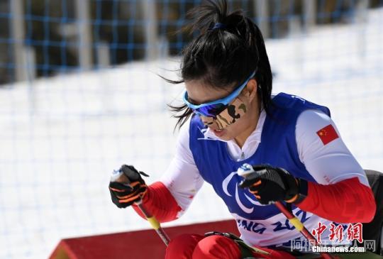 3月12日,中国选手杨洪琼在比赛中。当日,北京2022年冬残奥会残奥越野滑雪女子中距离-坐姿比赛在位于张家口赛区的国家冬季两项中心举行。中国选手杨洪琼获得金牌。 中新社记者 韩冰 摄