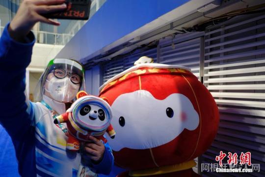3月10日,北京2022年冬残奥会吉祥物“雪容融”在候场时与志愿者合影。当日,“雪容融”现身国家游泳中心的轮椅冰壶比赛现场。 中新社记者 韩海丹 摄