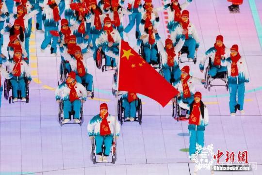 3月4日,北京2022年冬残奥会开幕式在北京国家体育场举行。图为中国代表团入场,由运动员郭雨洁(前排右)、汪之栋(前排左)担任旗手。 中新社记者 韩海丹 摄