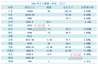 其中,广东2021年末全省常住人口12684万人,比上年末增加60万人。全年出生人口118.31 万人,出生率9.35‰;死亡人口61.12万人,死亡率 4.83‰;自然增长人口57.19万人,自然增长率4.52‰。