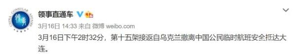 据外交部领保中心官方微博@领事直通车 消息,3月16日下午2时32分,第十五架接返自乌克兰撤离中国公民临时航班安全抵达大连。
