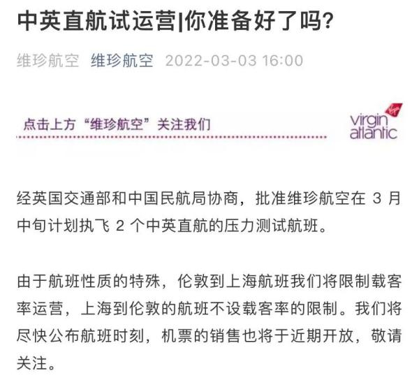 除此之外,英国维珍航空也计划在3月中旬执飞2个中英直航的压力测试航班,从伦敦直飞上海。