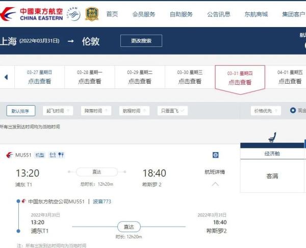 此外,东航也提供了直飞航班,于3月31日从上海浦东飞往伦敦希思罗。