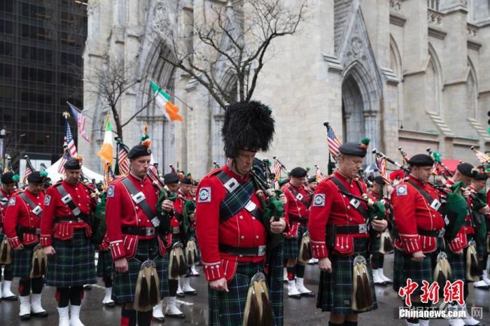 当地时间3月17日,纽约圣帕特里克节游行活动中的乐队队员向新冠逝者默哀。 中新社记者 廖攀 摄