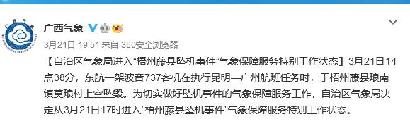 据广西壮族自治区气象局官方微博消息,3月21日14点38分,东航一架波音737客机在执行昆明—广州航班任务时,于梧州藤县琅南镇莫琅村上空坠毁。