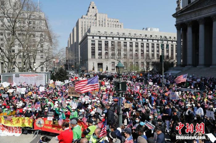 资料图:纽约举行反仇恨亚裔大游行,上万民众手持标语在曼哈顿弗利广场集会后,游行穿过布鲁克林大桥至布鲁克林卡德曼广场。图为游行民众在弗利广场集会。 中新社记者 廖攀 摄