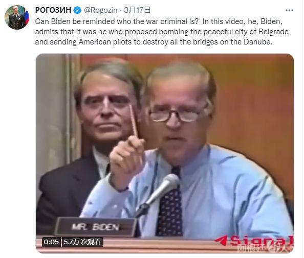 罗戈津贴出拜登早年在美参院推动空袭南联盟的视频。图片来源:推特页面截图。