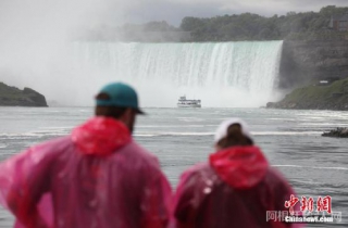 资料图:加拿大游客乘船游览加拿大、美国交界处的著名景点尼亚加拉大瀑布。中新社记者 余瑞冬 摄